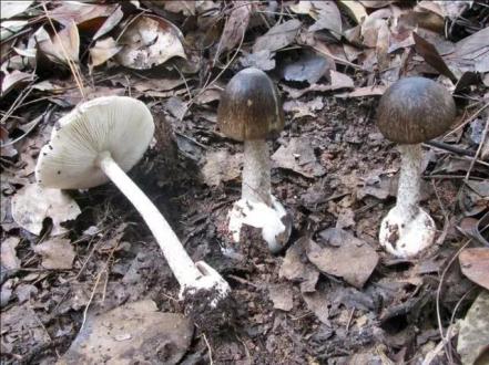 主要特征:子实体中等大小,5~10cm,灰色至深灰色、暗褐色至近黑色,表面具深色纤丝状隐花纹。菌柄白色至浅灰色,常被浅褐色鳞片,近顶部有菌环。基部近球形,有菌托。