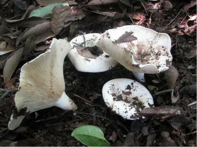 主要特征:子实体中等至大型,菌盖直径6~13厘米,中央下凹,脐状,后伸展近漏斗状,边缘反卷,白色至污白色,表面常具浅褐色鳞状物。菌肉较厚,白色,不变色。菌褶很密,近白色,受伤不变色。菌柄白色,短,4~6 cm,实心。
