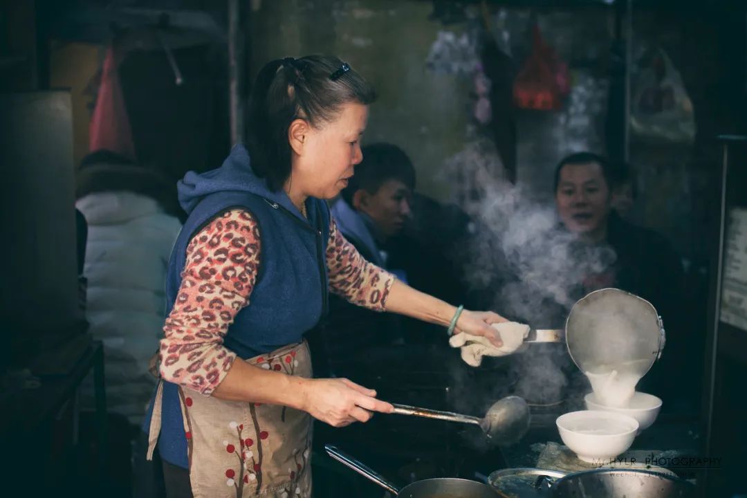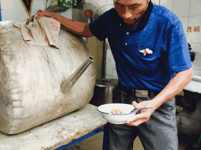 叫上一碗,师傅用掀开热气升腾的大瓦缸,用长柄木勺顺势搅上一勺扣入粗拉的瓦碗里。