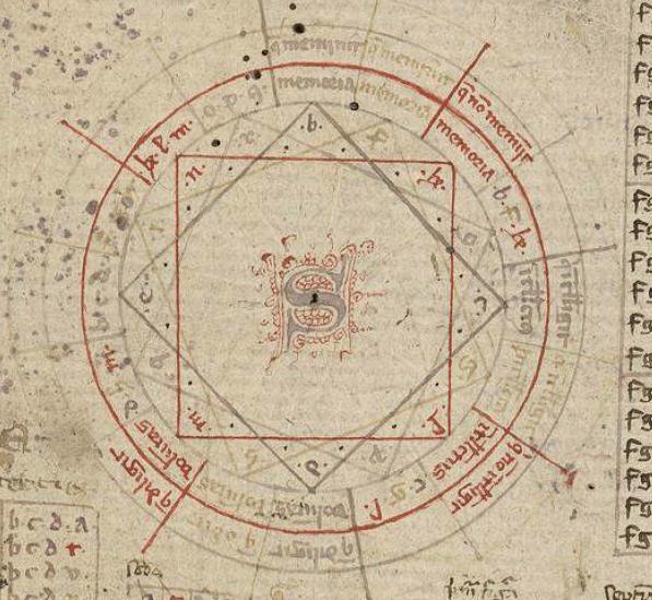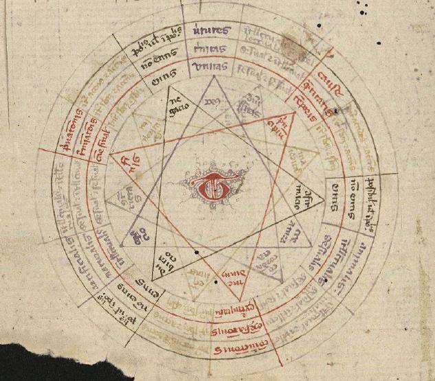 这是其中最简单的版本,两个内部圆圈包含九种“尊严”的拉丁文名称:善良,伟大,永恒,力量,智慧,意志,美德,真相和荣耀。为了简化,外圈分别用BCDEFGHIK字母代码来表示。