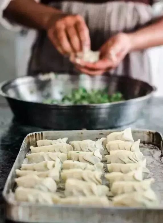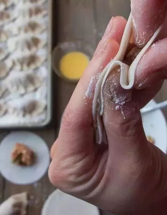 刚搅拌完的肉馅不容易包饺子,可以放置在一旁醒一会,或是直接放入冰箱冷藏30分钟,肉馅更紧实,更入味,而且更好包。