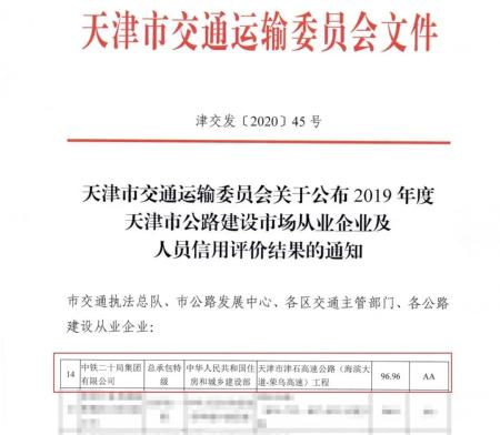 获评“天津市公路工程施工企业信用评价AA级”