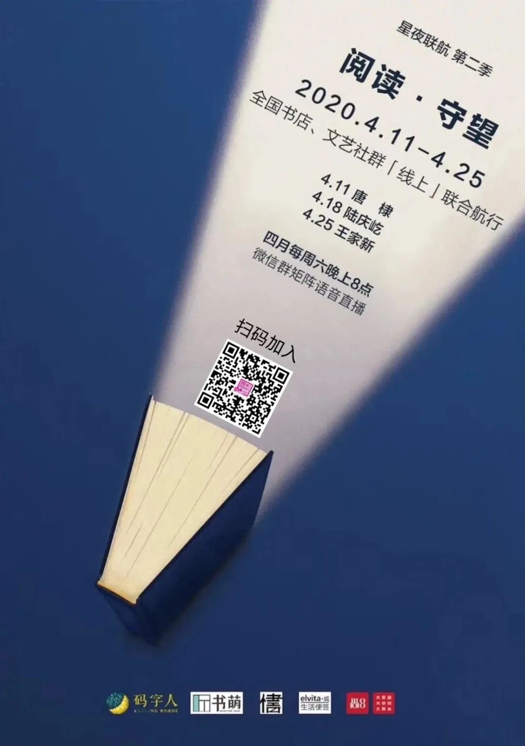 星夜联航第二季的主题是“阅读·守望”,四月的每个周六晚上8点,全国均有50-70家书店和社群超过一万名读者同步收听收看直播分享。唐棣、陆源、陆庆屹、王家新4位嘉宾依次做客星夜,在世界读书日即将来临的时刻,我们希望可以“在阅读中守护精神、在思考中追寻真理”。期待全国更多的实体书店和文艺社群加入,期望得到更多出版机构的支持,让四月的鲜花在阅读中肆意绽放。