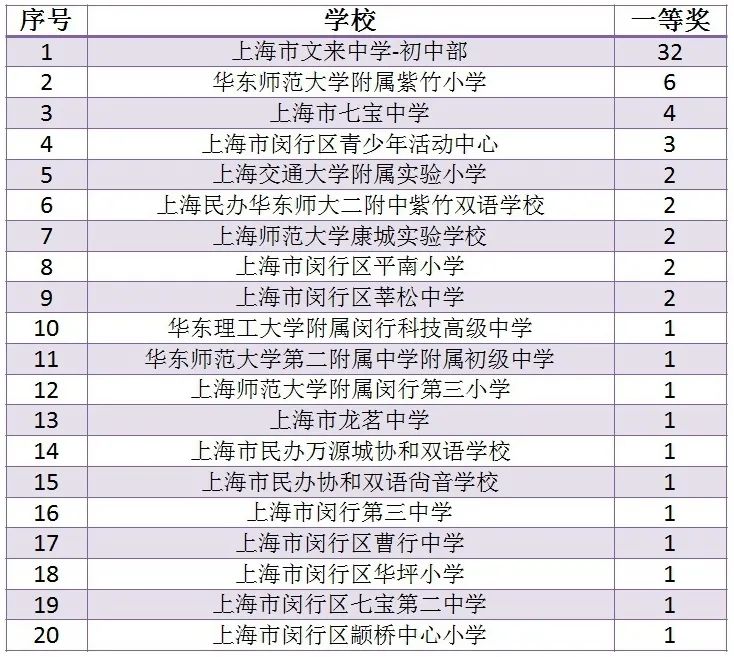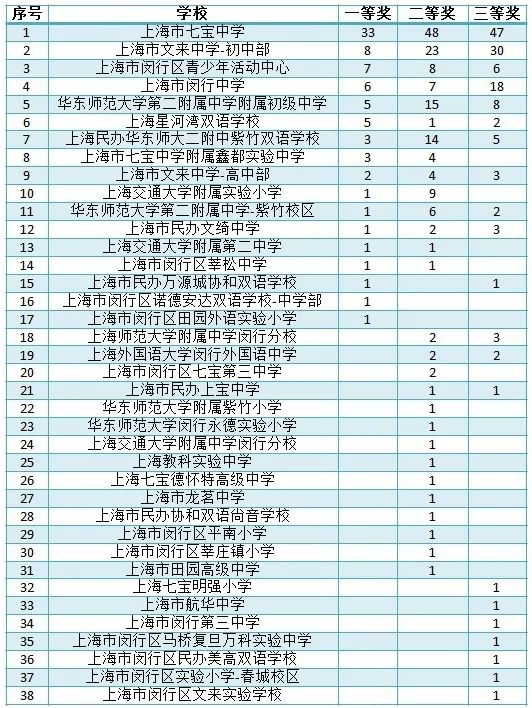 七宝中学以33个一等奖的优异成绩,继续雄踞全市各校之首;