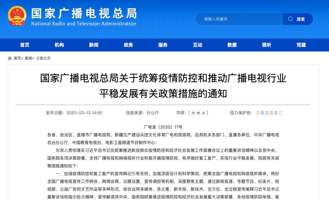 3月13日,国家广播电视总局发布《关于统筹疫情防控和推动广播电视行业平稳发展有关政策措施的通知》(以下简称《通知》),提出要加大对内容创作生产传播的支持力度,优化业务审批流程和方式,强化“智慧广电”新产品、新业态、新模式支持等12条措施,支持广播电视和网络视听行业开展疫情防控、有序做好复工复产、实现行业平稳发展。