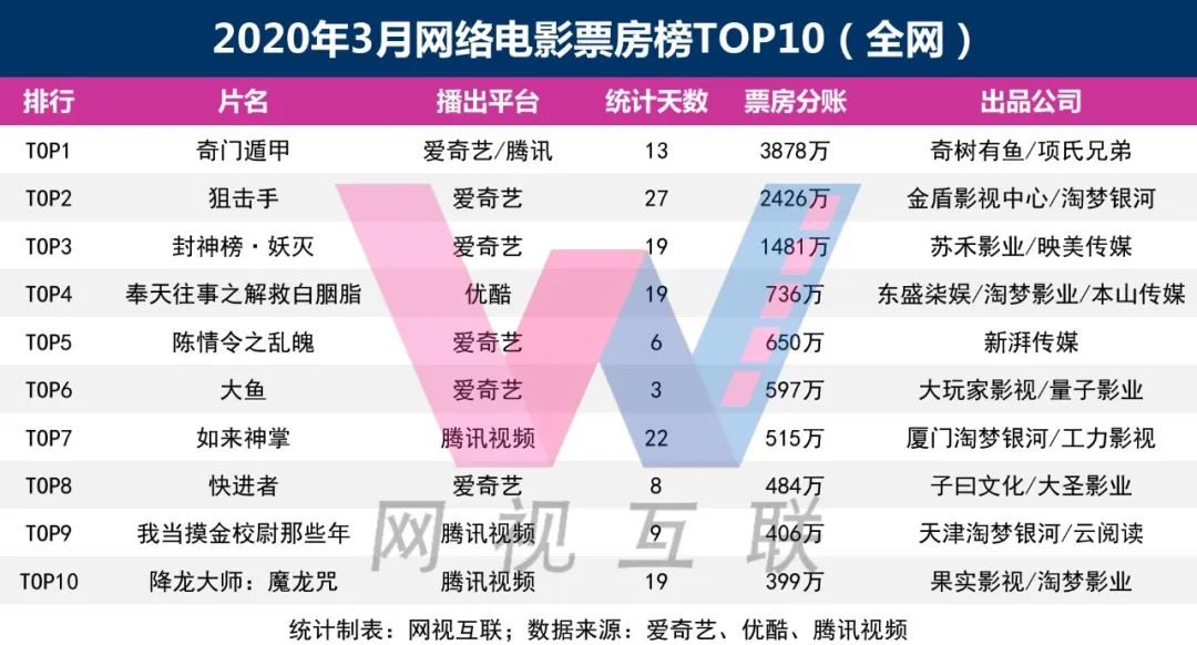 网视互联(ID:wxs360)在剔除掉旧片、累计票房之后,整理出了3月份全网网络电影票房分账榜TOP10。