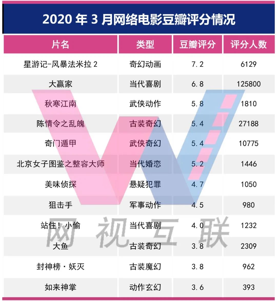 而3月份豆瓣评分5分以上网大明显增多,评分人数超过1000的影片更是达到了11部,甚至1个月出现了2部评分人数破万的影片。