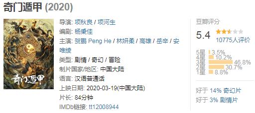 其中票房冠军《奇门遁甲》豆瓣评分虽然只有5.4,但评价人数突破了1万+。而作为爆款网剧《陈情令》的番外篇,《陈情令之乱魄》豆瓣评分也同样5.4,但评分人数高达27188人。这样的热度在网络电影里并不多见。