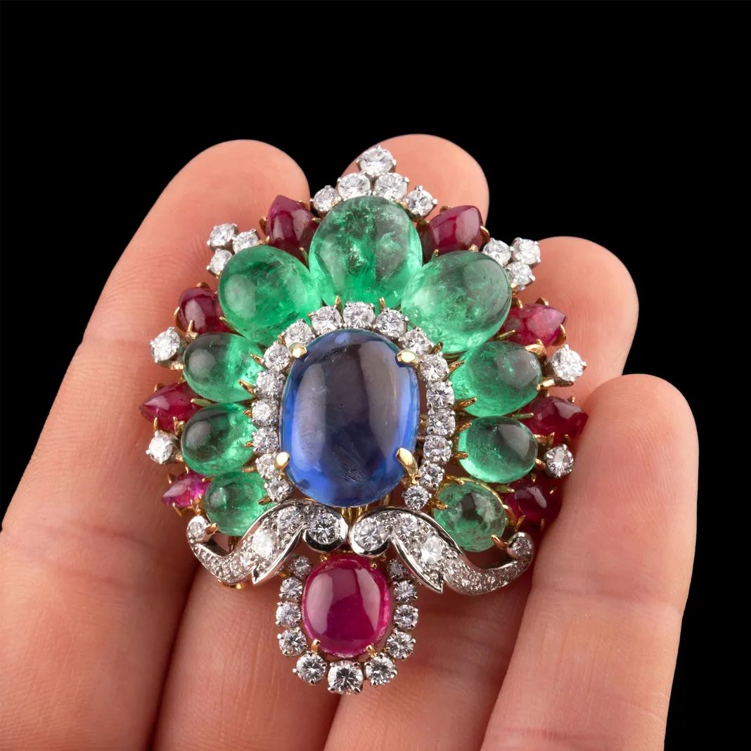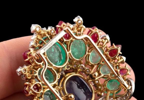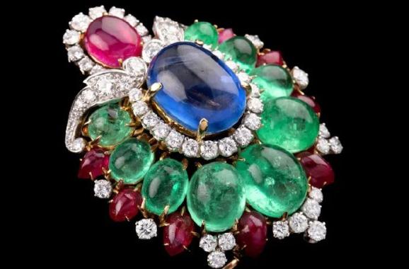 白金镶嵌蓝宝石红宝石祖母绿钻石胸针/吊坠