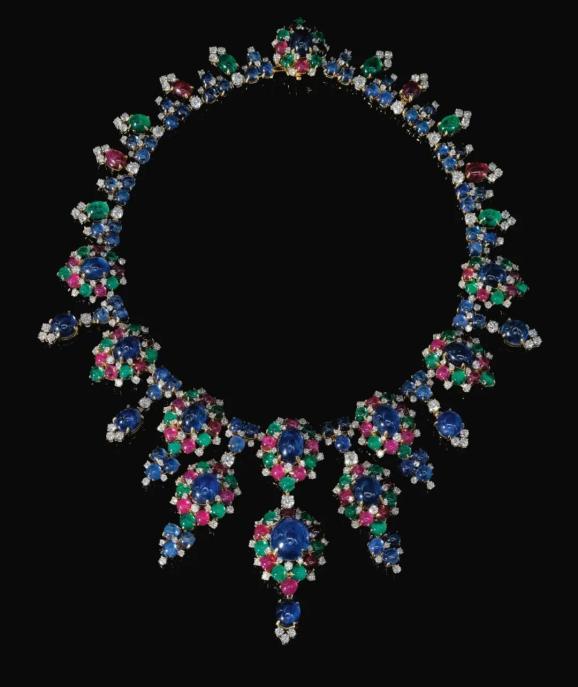 这一款宝格丽珠宝正是这一意大利世家在1960年代推出的经典。缤纷有色宝石明亮璀璨,品质极高,从中央蓝宝石至外层祖母绿、红宝石,以及白金镶嵌的璀璨钻石,将圆弧面宝石的纯粹与高贵,展现得淋漓尽致。