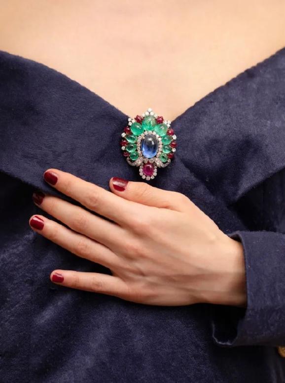这枚珠宝中央的一颗蓝宝石产自宝岛斯里兰卡,无加热处理,圆融、浓郁,约20克拉,震撼人心!外层一圈弧面祖母绿则产自哥伦比亚,无烧红宝石来自缅甸,每一颗宝石都尽显尊贵,其尺寸、其色泽叫人见之难忘!