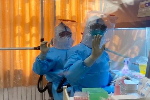 4月16日,在位于绥芬河市的负压帐篷式移动实验室,中国疾控中心病毒病所援助绥芬河检测队队员卢学新(左)与同事准备进行样本检测。新华社记者 杨思琪 摄