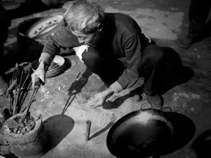 补锅匠补铁锅时,先把风箱拉得呼呼响,等着炉内的铁片融化成铁水。铁水通红后迅速舀起一小勺,顺着裂缝一点一点地补上去。