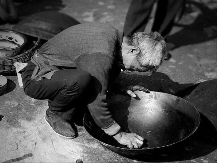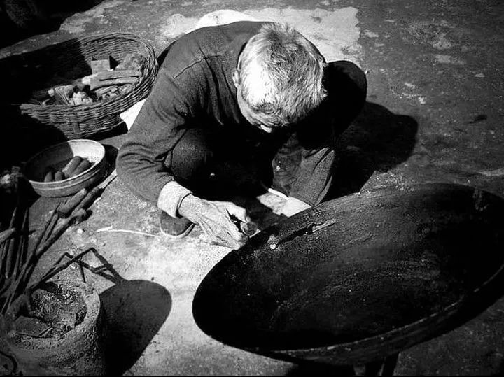 “补锅——补锅——哟!”补锅匠们挑着担子穿梭在大街小巷。担子一头是个木柜,里面放着各种补锅的工具,下面装着一个风箱。他们边走边沿街吆喝,有需要的主妇听到了就会喊住他们。