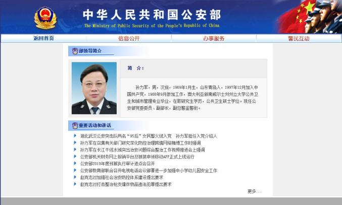 孙力军,男,汉族,1969年1月生,山东青岛人,1997年12月加入中国共产党,1988年9月参加工作,澳大利亚新南威尔士州州立大学公共卫生和城市管理专业毕业,在职研究生学历,公共卫生硕士学位。现任公安部党委委员、副部长,副总警监警衔。(简历摘自公安部官网)