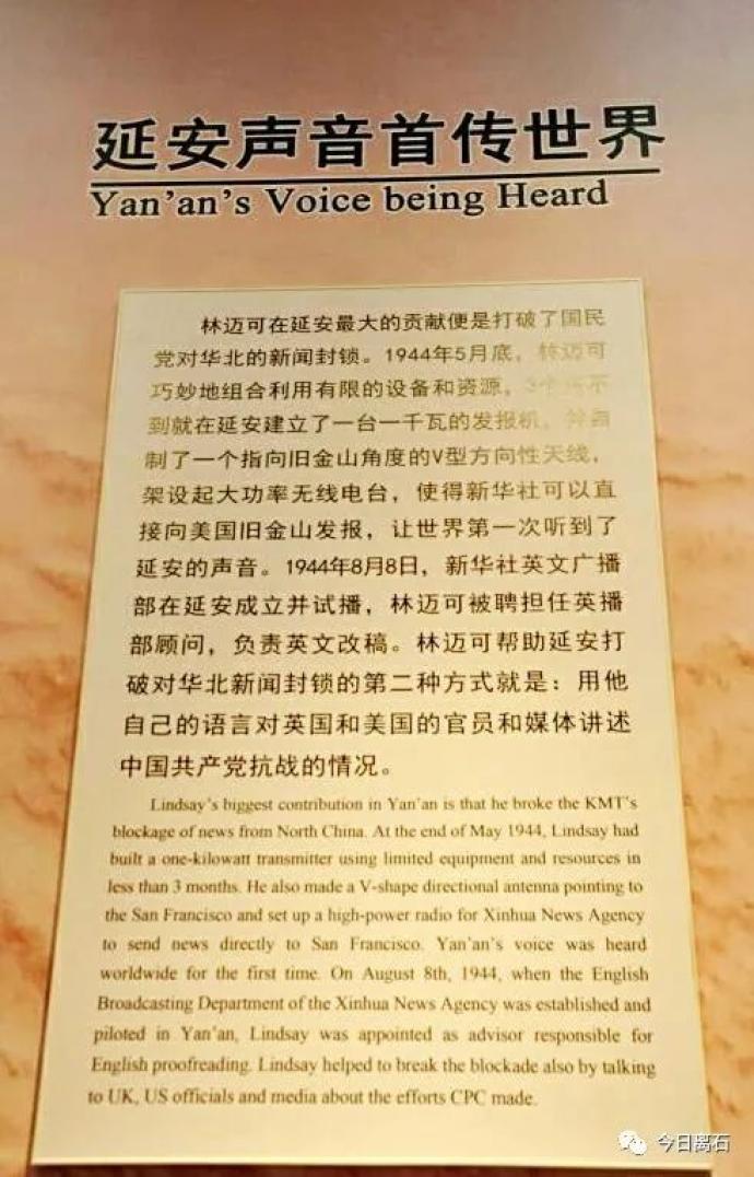抗战期间,全世界的新闻报道都已经是通过无线电用莫尔斯码传播,而延安没有能够发往世界的发射机,这意味着,中国共产党的新闻无法直接传往外界。加之国民党对华新闻的封锁,使得国内外对共产党抗日情况知之甚少,林迈可夫妇来到延安后,通过改善通信设备开播国际新闻,沟通中外记者、观察团,让延安与世界相通。