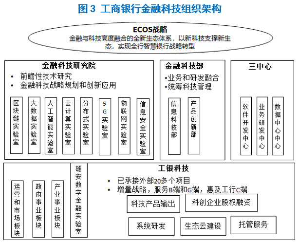 在组织架构方面,工行设立了工银科技和金融科技研究院。工银科技,对外提供系统研发、托管和运营支持服务,提供金融类业务系统、技术创新平台等产品。数字政务是工行未来金融科技输出的业务重点。工行金融科技研究院,重点做金融科技领域战略规划布局和创新应用,下辖涵盖区块链、大数据、人工智能、云计算、分布式、5G、物联网、信息安全8大金融科技创新实验室。