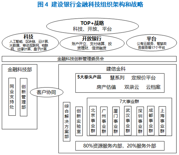 建行TOP+金融科技战略也很有新意。T(Technology)代表科技驱动金融创新;O(Open)代表建行技术和数据能力向社会开放,打造建设银行应用商店(CCB Store);P(Platform)代表平台生态;“+”代表“鼓励创新、包容创新”的机制和文化。