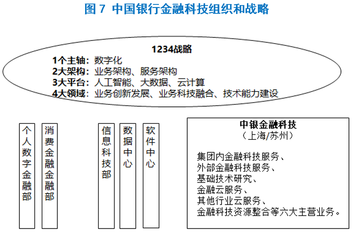 为了匹配数字化战略,中国银行大刀阔斧进行金融科技组织架构改革。2019年,中国银行将中国银行软件中心(上海)转制成为中银科技有限公司,共600余人。