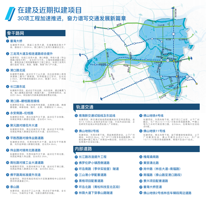 目前三龙湾南海片区紧抓交通网络建设,进一步完善线网结构。该片区目前在建及近期项目共30项,包含骨干路网、轨道交通、内部道路等,希望能真正做到广佛融城下的产业协同、制度共建、要素共享方面深度融合。