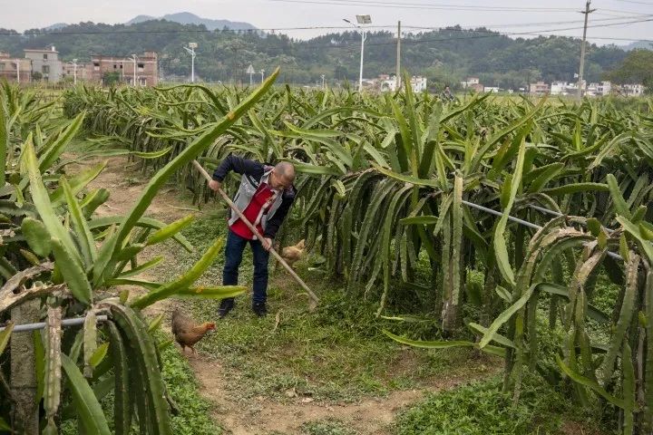 四月天气回暖,清新区石崇村的多个火龙果基地进入生长期。在位于石头墩的红心火龙果合作社内,村民黄柏洪正进行除草、追肥等日常管护工作。