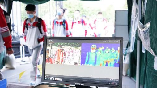 从宿舍到教室,昆明市女子中学的住校生还需要完成一个步骤:通过人脸识别自动测温仪检测体温。