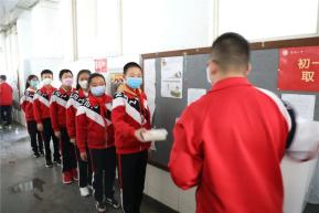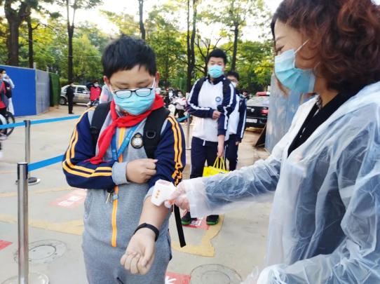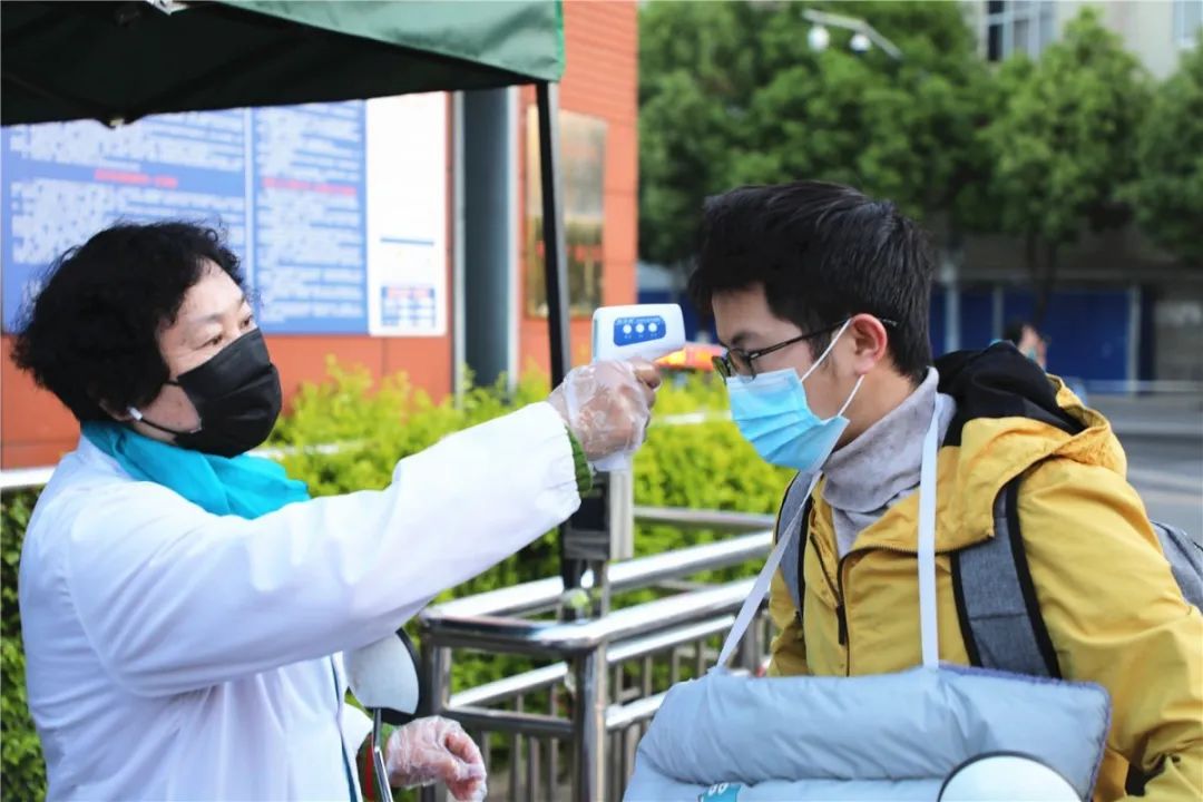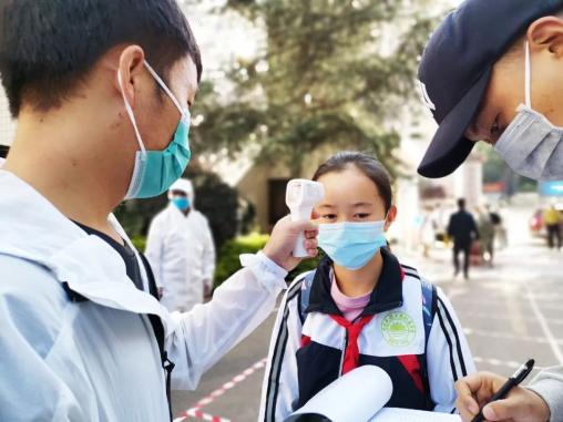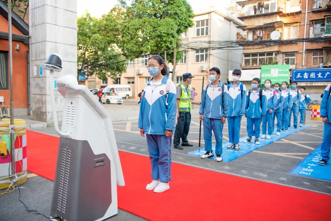 学校全体教职员工、校医室医生、门卫等早已在校门口“严阵以待”。各年级学生按照提前安排好的错峰时段,严格依照1.5米的间距,依次通过门岗查验、酒精消毒、红外线温度检测等“重重关卡”,回到教室。