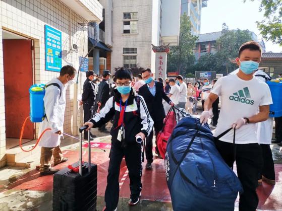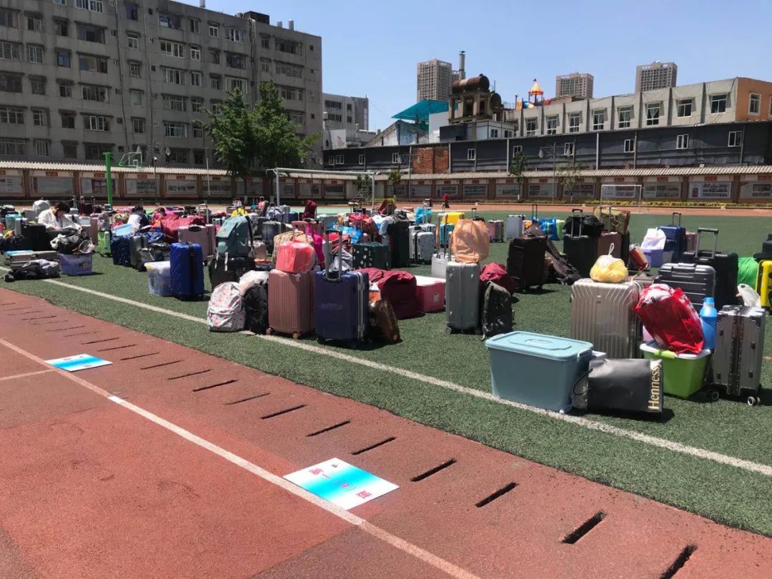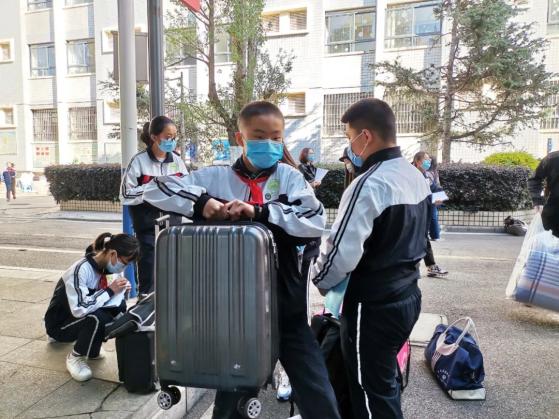 云南民族中学的学生是从中午12点开始入校的。1500多名学生,保持1米间距通过了学校的四道关,把行李放在操场上,再到教室门口扫了云南健康码,方可进入班级。