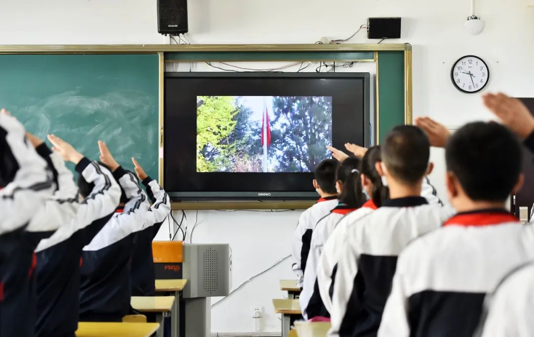 上午9点20分,云南民大附中学生张可人坐在初二(8)班教室里,静静等待新学期第一次线上升旗仪式。9点25分,屏幕里,国旗在激昂的国歌声中升起;屏幕外,张可人和同学们起立敬礼。
