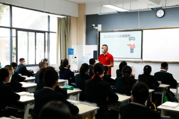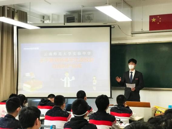 云师大实验中学复课第一天是上好《新冠肺炎及自我防护》。课堂上,各班班主任向学生详细讲解了在校期间所需要掌握的安全健康知识。