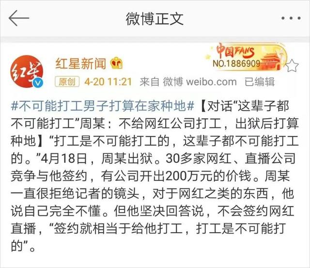 作为一个刑满释放人员,因为昔日的言论偶然踩中了大众的G点,就要被消费成新的流量网红,这不仅和短视频平台的初衷背道而驰,更透漏着娱乐至死的疯狂与恶臭。