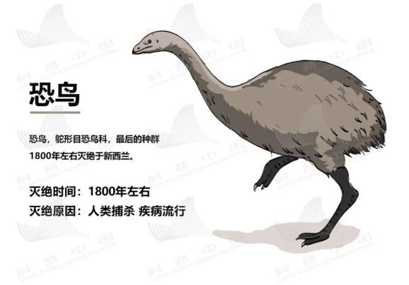 恐鸟,鸵形目恐鸟科, 比人类出现还早,最后的种群1800年左右灭绝于新西兰。灭绝原因:人类捕杀,疾病流行。