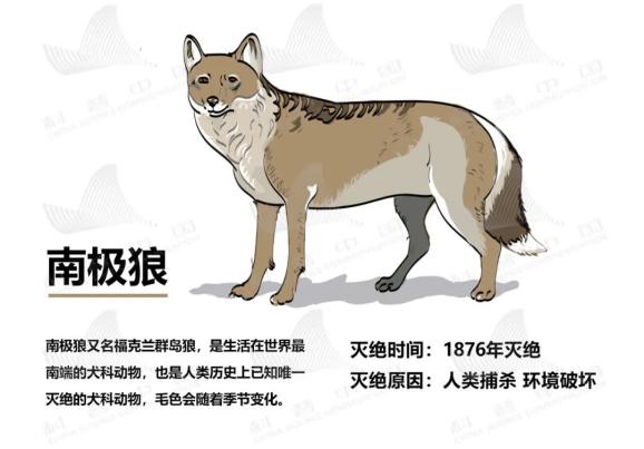 南极狼,又名福克兰群岛狼,是生活在世界最南端的犬科动物,也是人类历史上已知唯一灭绝的犬科动物,毛色会随着季节变化。1876年灭绝,灭绝原因:人类捕杀,环境破坏。