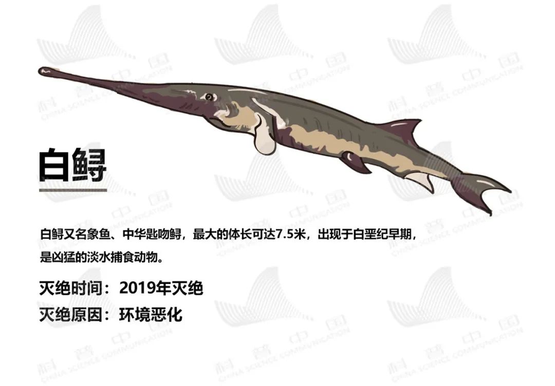 白鲟,又名象鱼、中华匙吻鲟,最大的体长可达7.5米,出现于于白垩纪早期,是凶猛的淡水捕食动物。2019年灭绝。灭绝原因:环境恶化。