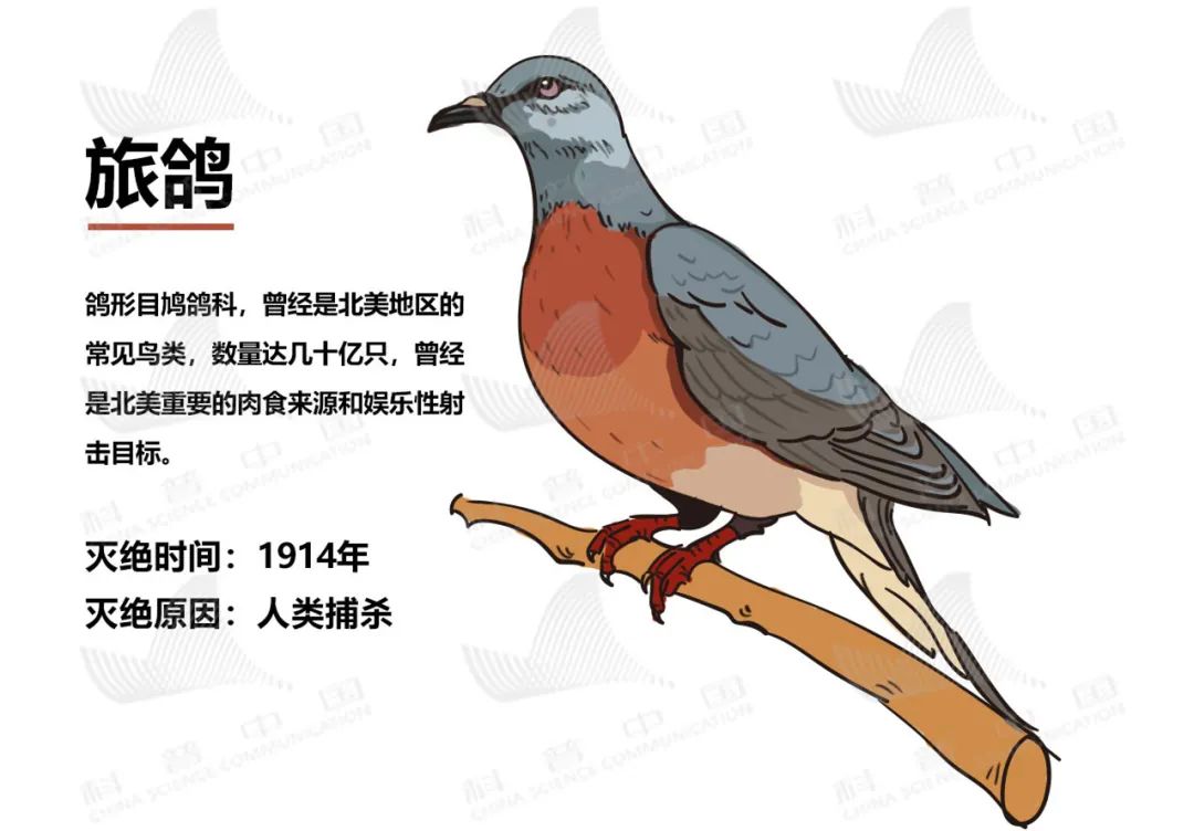 旅鸽,鸽形目鸠鸽科,曾经是北美地区的常见鸟类,数量达几十亿只,曾经是北美重要的肉食来源和娱乐性射击目标,1914年灭绝。灭绝原因:人类捕杀。