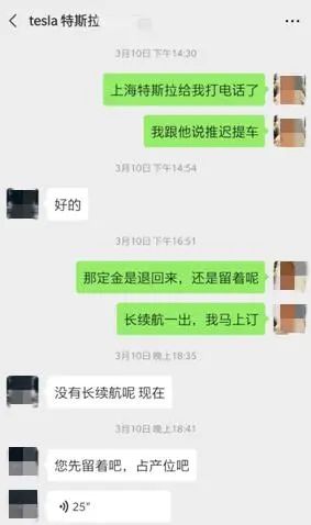 张先生说,自己今年1月12日在温州特斯拉财富中心门店付了2万元定金,3月5日收到微信通知:车辆预计于未来3周生产,预计交付时间为3月下旬。
