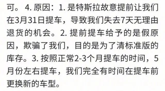 “4月10日,特斯拉官方发布了长续航车型上市,我才意识到特斯拉利用经营者与消费者信息不对称在诱导我提车,于是我立即拨打销售人员电话要求退车,被其告知我已错过7天信心保障计划的保障期,不能退车。”张先生称,自己和其他车主都遭遇了特斯拉的“消费陷阱”,经销售人员的建议“被提前”提车,无意中为特斯拉去库存。