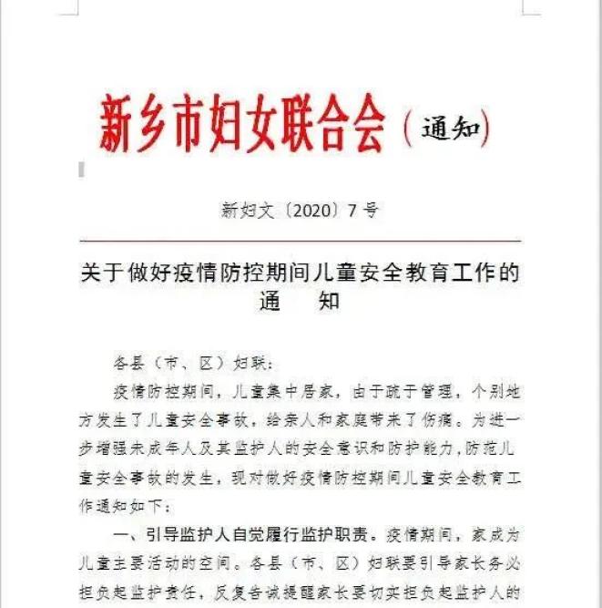 据河南省新乡市妇女联合会发布的消息,4月20日,新乡市妇联发布《关于做好疫情防控期间儿童安全教育工作的通知》,提醒该市家长注意安全防范。通知从监护人职责、家庭教育指导、安全教育工作等共四个方面提出了要求。其中指出,加大宣传力度,普及安全知识,教育儿童远离施工工地、土丘沙丘。