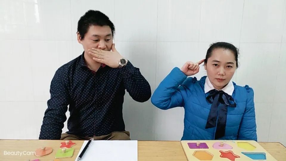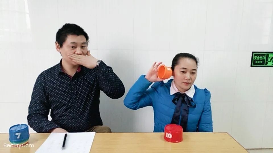 1.让孩子把套杯(增强物)贴在耳朵或脸颊的位置做好听准备。