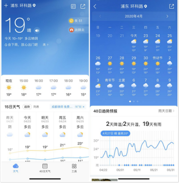 40日预测,上半部分日历模块+下半部分趋势图模块相结合,用户不仅可以直观看天气。温度趋势和降水趋势于一张图中显示,方便锁定关注的日期是否有降雨,且明确该天在整个40天温度趋势中,所处的情况。