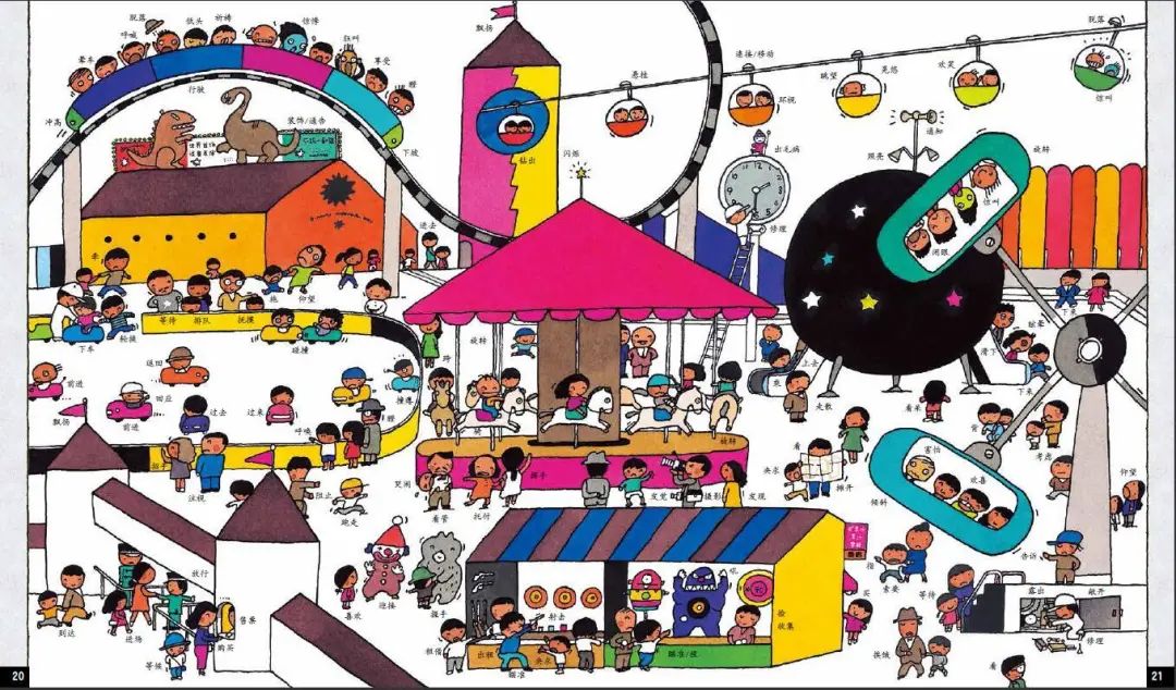 返回某一页再观察一下某个词周围的图画和词汇,小朋友会有全新的发现,那种灵活使用词汇的乐趣就会被唤醒。