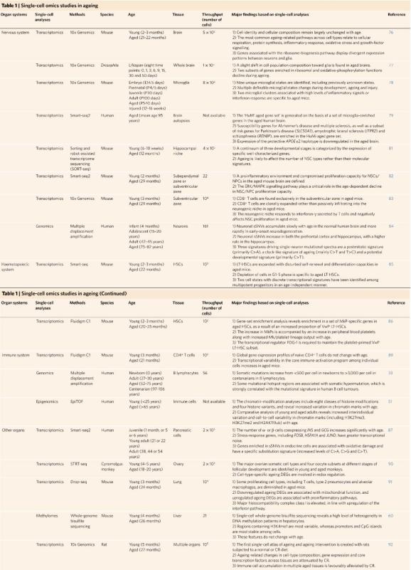 在以下各节中,我们将介绍单细胞测序数据分析中涉及的核心概念,它们在当前和将来的应用以及在衰老领域中的潜在重要性。这些应用已经促进了对一些最脆弱器官(例如脑、骨髓、胰腺和肺)的衰老过程的理解(表1)。最新的结果证明了单细胞技术的变革潜力,尤其是对于目前组织老化必然过程的研究和临床干预。