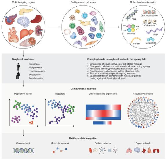 衰老是一个异质性的过程,在这个过程中,单个细胞的紊乱表现出不同程度地增加,从而导致器官和组织功能逐渐下降。研究衰老相关的细胞和分子特征将有助于深入了解复杂的衰老过程的细节,并揭示导致衰老的因素。为了实现这一目标,已经通过使用混合细胞群或使用已知标记物富集的细胞群在模式生物和人类的细胞水平上进行了研究,这两种方式都可能随年龄而变化。
