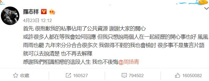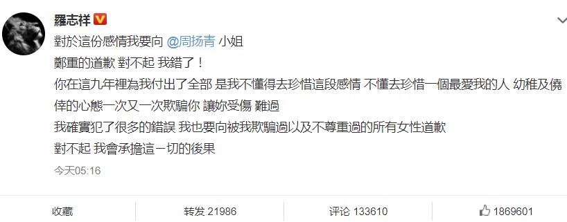 周扬青这条微博发出来后,很快罗志祥就在微博回应:▼