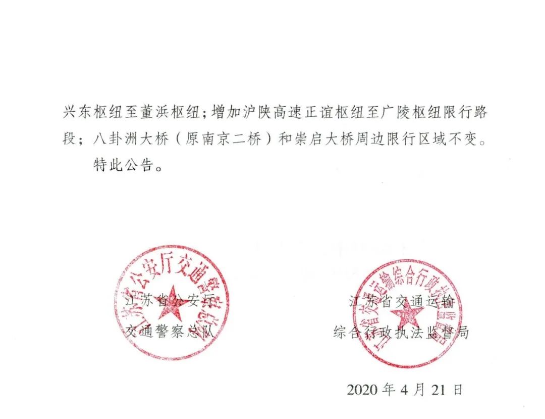 八卦洲大桥(原南京二桥)和崇启大桥周边限行区域不变。