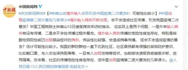 与之相反,钟南山院士在4月1日接受媒体采访时表示,新冠疫情在中国仍须警惕,但预计不会出现第二次暴发。“因为我们有强有力的监测系统。一旦发现(病毒感染者)立即隔离,对其密切接触者也进行隔离观察,在很早的时间切断传播链,它不会引起暴发。”