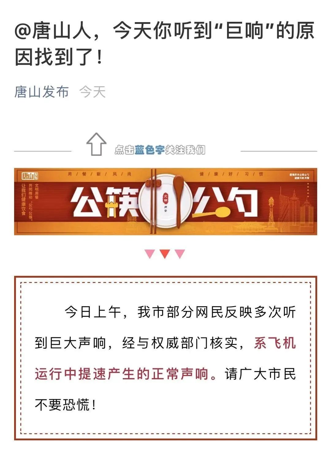 今天上午,部分唐山网友反映多次听到巨大声响。对此,唐山发布公众号回应:经与权威部门核实,系飞机运行中提速产生的正常声响。请广大市民不要恐慌!