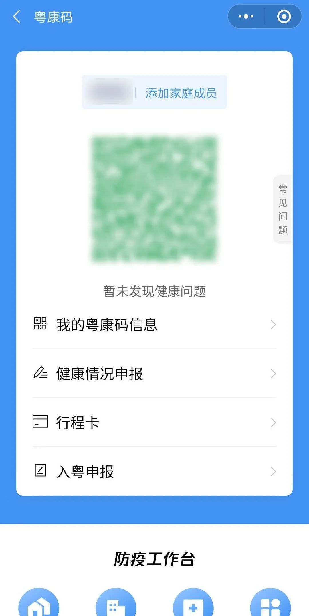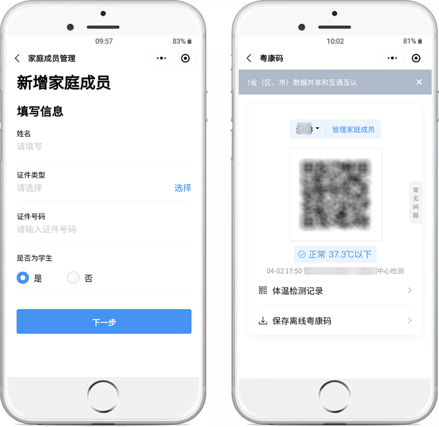 如家里有老人、小孩等不方便使用手机的人员,可点击粤康码上方的“添加家庭成员”,填入家庭成员的姓名与身份证号,并让其进行人脸识别认证。
