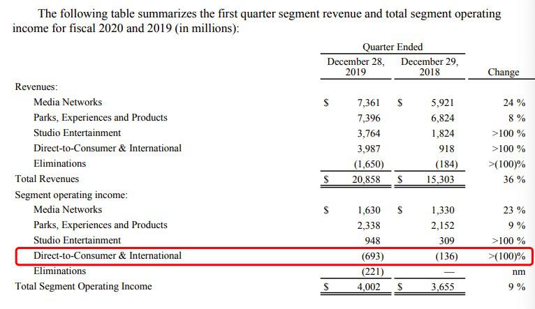 《棱镜》翻看迪士尼财报注意到,2020财年一季度(去年10-12月),迪士尼的流媒体和国际业务亏损了将近7亿美元(下图),比前一年同期大幅增加5个多亿,主要就是因为Disney+上线、ESPN+的亏损以及从收购福克斯后控股另一大流媒体Hulu带来的损失。
