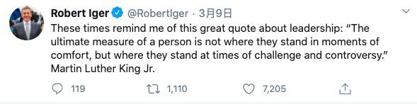 艾格很少在人前表露焦虑。他上个月发了一条推特,引用了民权领袖马丁·路德·金的名言:“衡量一个人的最终标准,不是看他在顺境时的表现,而是看他如何面对挑战和争议。”